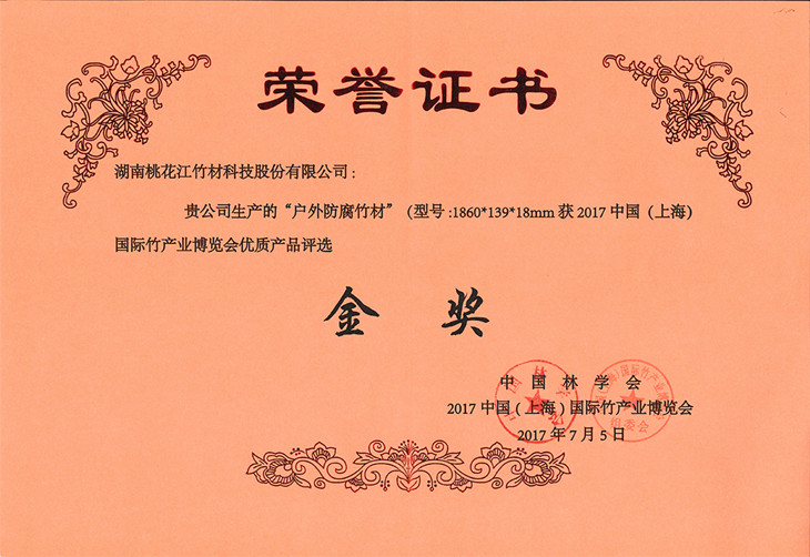 湖南桃花江竹材科技股份有限公司生產(chǎn)的戶外防腐竹地板在2017年7月中國(上海)國際竹產(chǎn)業(yè)博覽會中榮獲金獎,該獎項(xiàng)由中國林學(xué)會、中國(上海)國際竹產(chǎn)業(yè)博覽會頒發(fā)。湖南桃花江竹材科技作為中國竹材領(lǐng)域高炭防腐技術(shù)的發(fā)明者,在中國竹材領(lǐng)域有著舉足輕重的地位。湖南桃花江竹材科技一直專注與于竹材的戶外運(yùn)用研發(fā)與創(chuàng)新,為全球客戶提供優(yōu)質(zhì)竹材。